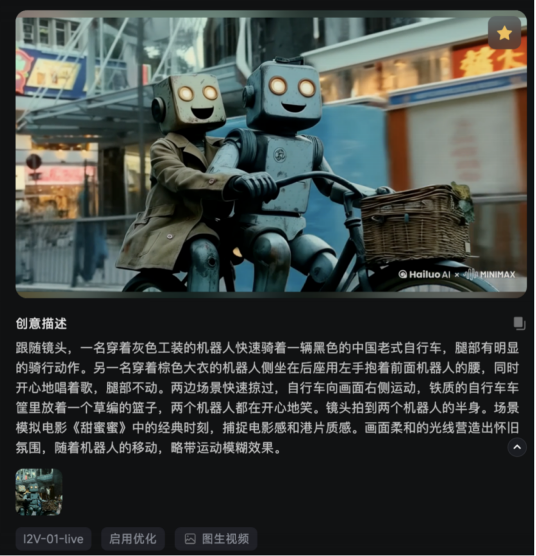恰在此时,我们获悉海螺 AI 的文生视频功能得到升级,且该平台一直致力于推广其文生视频技术。基于此,我们萌生出将两种技术融合运用的想法。在影片创作中,我们将影片划分为两个部分:开篇运用灵活性较强的文生视频工作流,以其独特的表现方式来塑造机器人的动作,完美契合影片所需的荒诞风格;在后续经典电影重现部分,先通过文生图生成基础画面,再经后期处理后转化为图生视频,以此精准复刻经典片段的镜头语言。在后续混剪段落的剪辑过程中,我们综合考量电影技术发展脉络、剧情走向、制片地区特色以及情感表达需求等多重因素,精心编排混剪顺序,使得每一个画面都成为人类电影创作传统与AI算法深度融合的结晶,为观众带来别具一格的视觉盛宴。